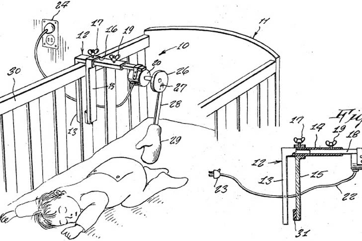 1963년에 기계식 아기 침대가 “엄마의 손길을 흉내 내도록” 설계되었는데, 두 개의 부드러운 고무 손으로 아기의 등을 토닥이는 방식이었습니다. 이 기계는 아기를 흔들어주면서 몇 초마다 부드럽게 등을 두드려 트림을 돕고 아기를 편안하게 해주었습니다.