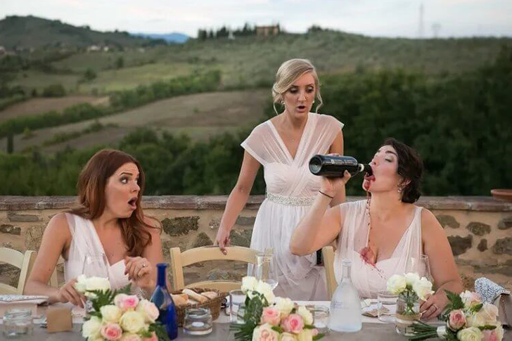Three friends, three emotions: Two bear wine stains on their clothes, while the third stares as if stunned. Apparently a wine mishap, showing that true friendship endures even beyond spilled glasses.