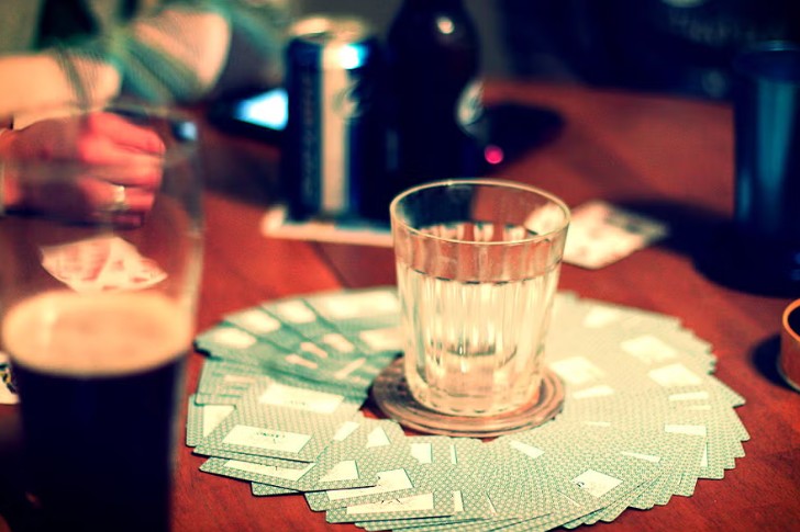 Arrange playing cards in a circle around a large central “king’s cup” filled with a mystery mix of drinks. Players draw cards one by one and follow preset rules – like “waterfall” (everyone drinks until the person before stops) or “make a rule” (anything from no swearing to thumbs on table).