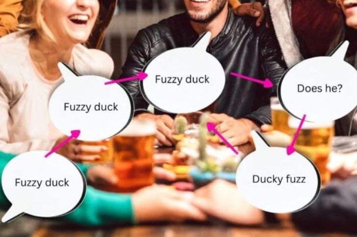 Sit in a circle passing the phrase “Fuzzy Duck” back and forth. At any point, someone can say “Does he?” to reverse direction and switch to “Ducky Fuzz” – mess up the words or timing and you drink.