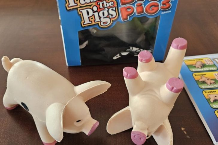 Players toss two tiny pig-shaped dice and score points based on how they land (snout up, razorback, etc.). Keep rolling to build your score or bank points – land on certain losing combinations and you bust to zero.