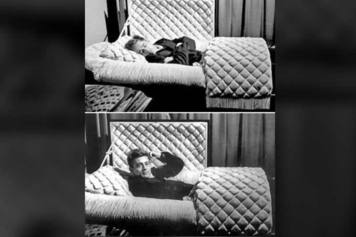 James Dean posing inside a coffin for a photo just 7 months before he died in a car crash in September 1955.