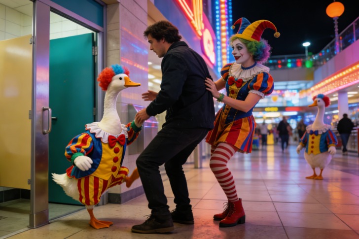 I was once in a mall late at night and stopped to use the bathroom. As I came out of the stall, a goose dressed as a clown was standing in the doorway of the bathroom. After I finally got around the clowngoose and started running away, I crashed into a woman dressed as a clown who asked me “have you seen my goose?”