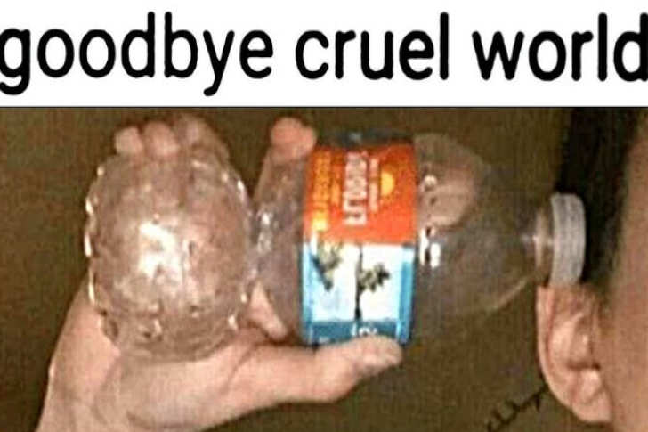 This meme shows a crushed soda can next to a bottle with the text “goodbye cruel world,” making a darkly funny joke about the disappointment of a soda can exploding in your bag. It’s the perfect way to react to a small, annoying disaster—like when your lunch gets squished or your headphones break. The dramatic caption turns a minor inconvenience into a hilarious overreaction.