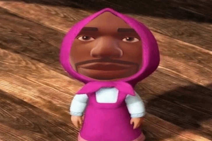This meme takes the cute cartoon character Masha from Masha and the Bear and replaces her face with a stoic Black man’s expression, creating an absurdly funny contrast. It’s perfect for reacting to a situation that feels awkward or just plain weird, like when your friend shows up to a formal event in sweatpants. The deadpan expression in a pink frilly outfit is the ultimate mix of innocence and chaos.