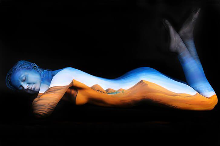 Diese Frau verwandelt ihren Körper in eine Leinwand, um die atemberaubende Schönheit der Wüste darzustellen, indem sie Sanddünen und eine Oase aufmalt. In ihrem Werk sind Kamele zu sehen, die sich in Richtung des Gewässers bewegen. In der Wüste sind Kamele häufig als Transportmittel im Einsatz und spielen eine wichtige Rolle im Leben der Beduinen-Nomaden.