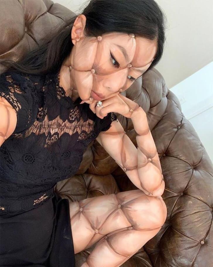Die Körperkunst dieser Frau lässt sie aussehen, als würde sie allmählich mit den Möbeln verschmelzen. Auf ihrer Haut ist das rautenförmige Muster eines Ledersofas nachgebildet. Die braune Färbung des Sofas fehlt zwar, aber vielleicht ist dies noch Teil des fortschreitenden Prozesses.