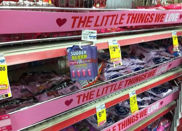 We’ve all heard horror stories about bad dates, and safety is a major concern for many women. They are constantly reminded to watch their drinks and stay alert. This store display doesn’t help ease those fears. Right next to the Valentine’s cards, they’ve stocked “fast-acting sleep” medication.
