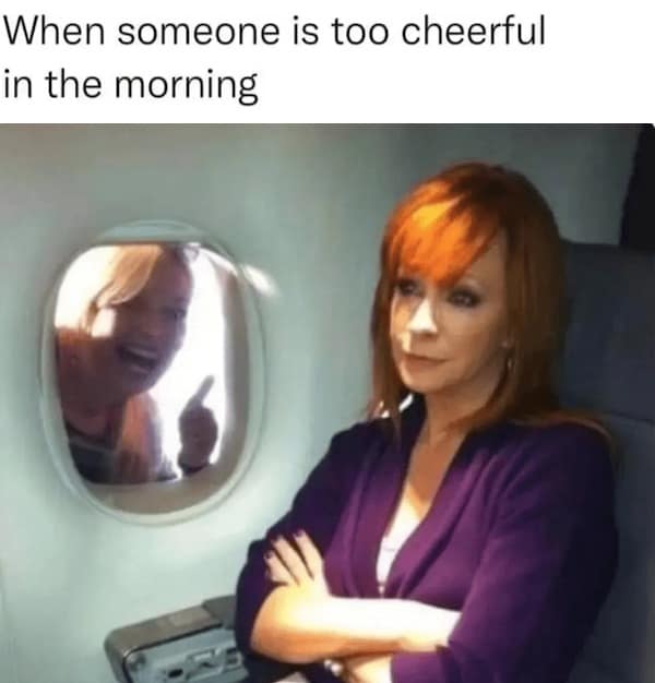 40+ 個你常見的迷因圖,這次終於搞懂背後意涵 #19 Advertisements 這個迷因呈現了一位坐在飛機上的女性,臉上毫無表情,而窗外的人卻興奮異常,笑容滿面。標題寫著:「當早上有人過於開朗時。」 Advertisements 上頁下一頁 基本上,它在嘲諷早上還沒準備好應對別人旺盛精力的那種煩躁感。你懂的,當你還半夢半醒時,有人卻興高采烈地說著:「早安!今天是不是很棒啊?!」而你心裡只覺得,不,今天一點都不棒。這就是典型的「晨型人與非晨型人」之間的對比。 Advertisements PREV NEXT PAGE