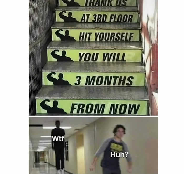 40+ 個你常見的迷因圖,這次終於搞懂背後意涵 #38 Advertisements 這個迷因的笑點在於,有人被要求在樓梯上寫勵志訊息,好讓來健身房的人在爬樓梯時能受到激勵。然而,負責書寫的人卻把這些句子完全搞混了,寫得亂七八糟。 Advertisements 上頁下一頁 結果,呈現在大家眼前的是一堆混亂、令人摸不著頭緒的訊息,根本沒辦法好好閱讀,讓人看得一頭霧水,而不是感覺受到激勵。這真是一個好心辦壞事的搞笑例子! Advertisements PREV NEXT PAGE