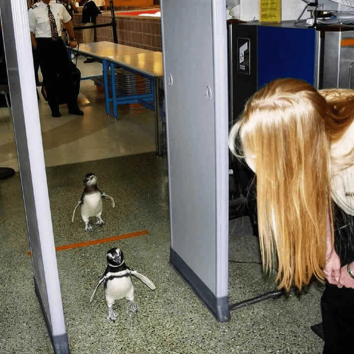 Non tutti i viaggiatori hanno due gambe; alcuni hanno le pinne. Penny e Pete, due pinguini “educativi”, volano frequentemente per lavoro e devono passare attraverso gli stessi scanner di sicurezza dei passeggeri umani.
