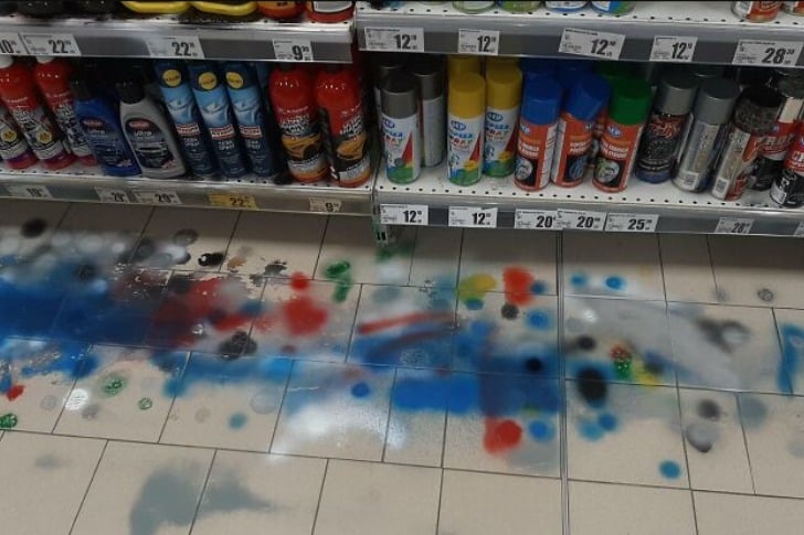 Baumärkte: Testen Sie Sprühfarbe an den dafür vorgesehenen Stellen, nicht auf willkürlichen Oberflächen. Aber diese Tester verwandeln Gänge in abstrakte Kunstkatastrophen und hinterlassen den Mitarbeitern eine Sauerei zum Aufräumen. Warum nicht die Matte benutzen?
