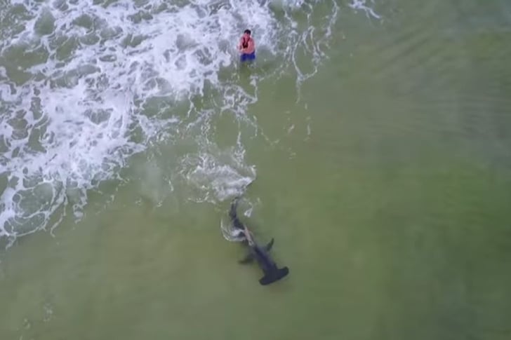 ハンマーヘッドシャークは、温暖な海に生息する攻撃的なサメとして知られています。人間との接触もあり、脅威を感じると襲うことが多いと言われます。このドローン写真は、フロリダ州パナマシティのビーチで撮影され、女性が近くにいるシャークに気づいていない瞬間を捉えています。