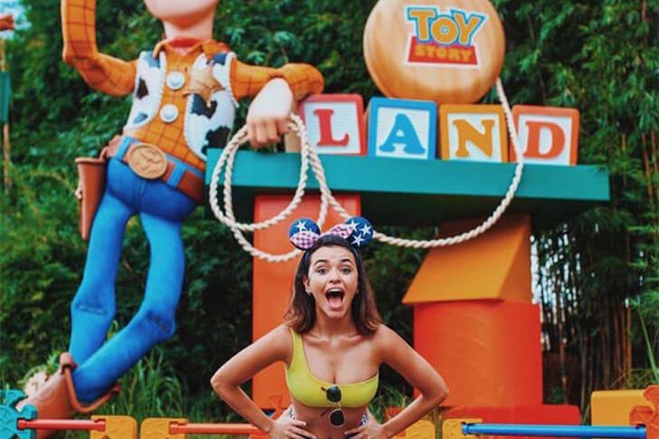 這位年輕女性看起來對玩具樂園感到非常興奮,甚至將她的服裝與《玩具總動員》的主角搭配。人們不禁會想,她從小到大看了多少次胡迪和他的夥伴們的故事——她對這部電影的熱愛透過這套俏皮、主題性的服裝展露無遺。