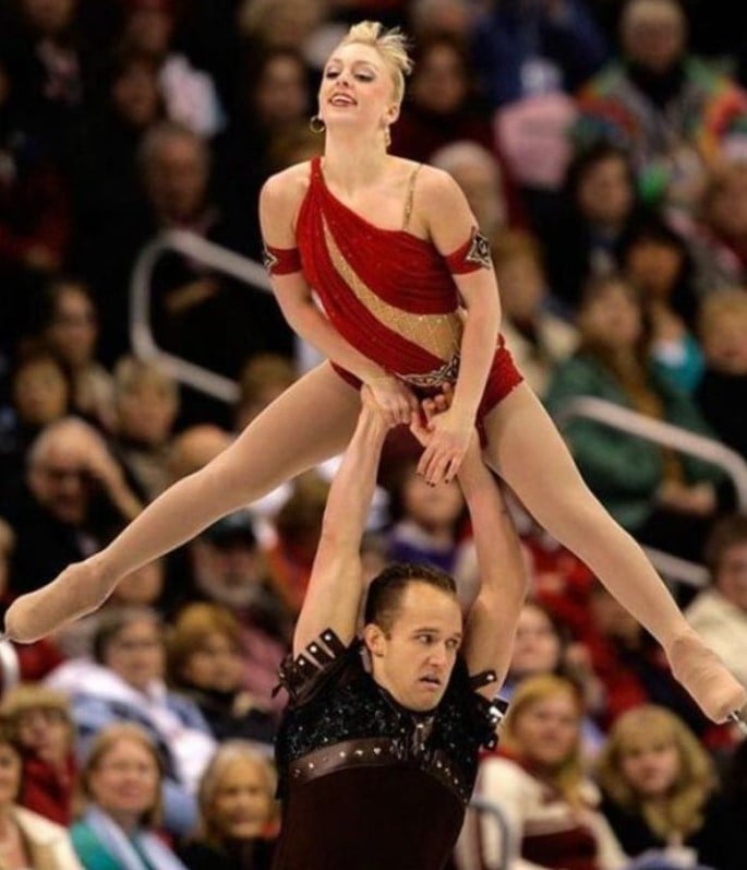 El patinaje artístico en parejas exige una coordinación y confianza perfectas, pero a veces, los micro-errores deshacen incluso los levantamientos más hermosos. Aquí, la patinadora mantiene un elegante equilibrio sobre los hombros de su compañero, pero sus manos delatan un desastre inminente: dedos ligeramente mal colocados, distribución del peso ya colapsando.