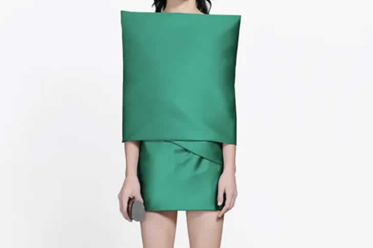 ¿Es esto una declaración de moda revolucionaria, o alguien se peleó con un contenedor de envío? Este conjunto verde lima presenta un cuadrado gigante y rígido que oculta completamente la parte superior del cuerpo, lo que lo convierte en el atuendo perfecto para cualquiera que valore la privacidad por encima de la visión periférica. Sin duda, es una forma de garantizar el espacio personal en una fiesta concurrida, aunque navegar por una puerta podría requerir un equipo de mudanzas profesional.