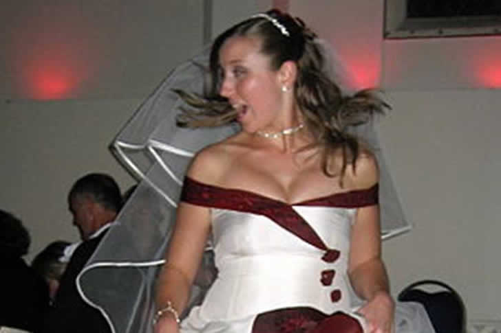 No conozco a nadie que ame el marrón lo suficiente como para incorporarlo a su vestido de novia. Excepto, quizás, esta chica. Aunque el corte del vestido es atractivo, ese horrible marrón arruina cualquier posibilidad de que el vestido sea elegante. ¿Y por qué hay un enorme recorte marrón en la parte delantera de la falda?