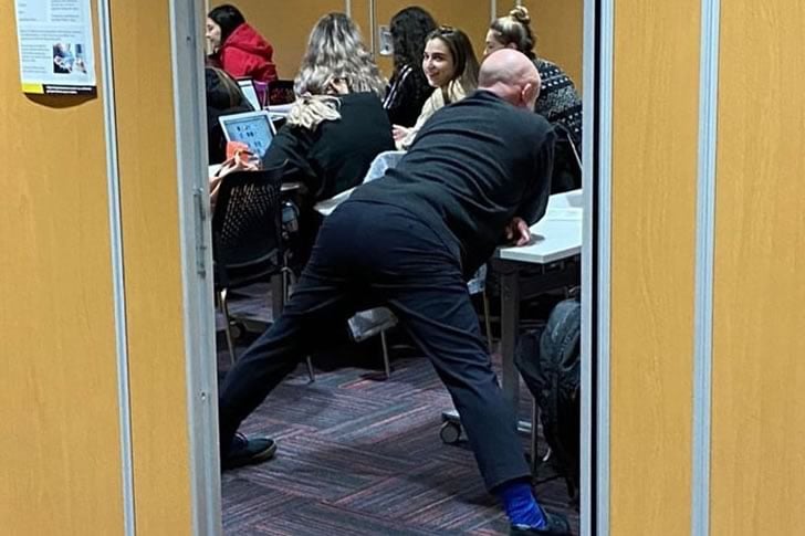他那極致的弓箭步與隨意的課堂環境形成強烈對比,讓這個場景更加有趣。旁人似乎都沒特別感到驚訝——或許他們已經習慣了這種互動方式。又或許他們只是努力憋住笑聲。無論如何,這是一個完美捕捉到的瞬間,呈現了某人為了參與度而犧牲了人體工學,為一個再普通不過的場景增添了意想不到的戲劇性。
