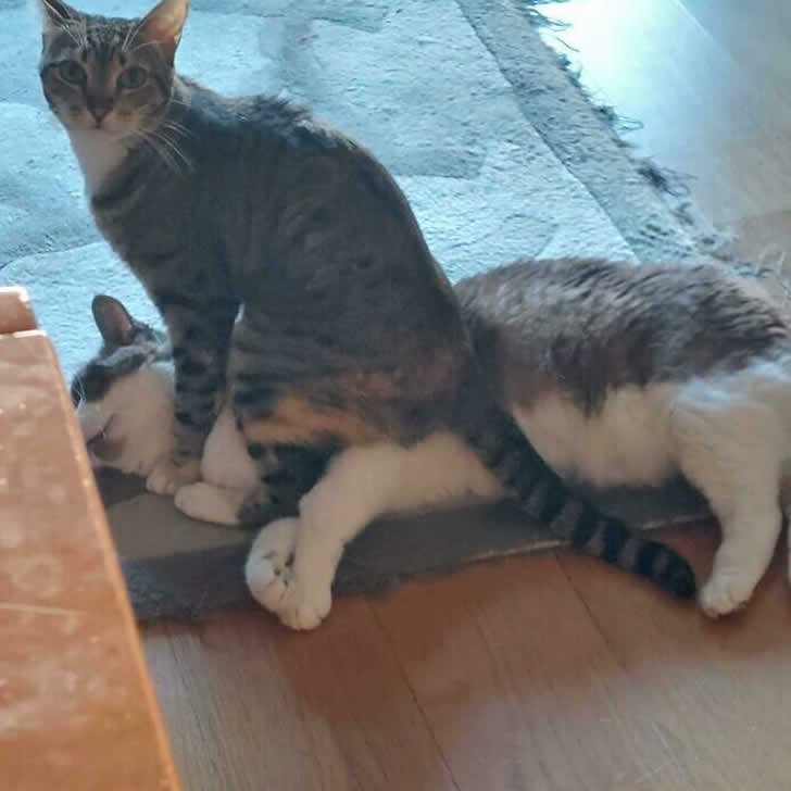 Prendiamo ad esempio questa scena. Un gatto è disteso immobile, mentre l’altro gli sta sopra come un soffice cattivo da film noir. È amicizia, dimostrazione di forza o tentato omicidio? Difficile dirlo. Il gatto sotto sta dormendo pacificamente o ha esalato l’ultimo respiro in silenzio? È difficile distinguere.