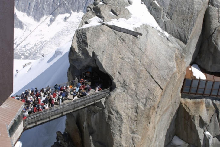 Aiguille du Midi è una montagna delle Alpi francesi, nel massiccio del Monte Bianco, il cui nome significa “Ago di Mezzogiorno”. Questo nome deriva dal fatto che a mezzogiorno il sole sembra trovarsi proprio sulla cima, come la lancetta di un orologio. Vicino alla cima di questa montagna è stato costruito un breve ponte che offre una vista spettacolare a 360 gradi, molto apprezzato dai turisti. Raggiungere la vetta, che potrebbe sembrare un privilegio riservato agli alpinisti, è sorprendentemente facile e veloce: solo 20 minuti di funivia dalla città ai suoi piedi.