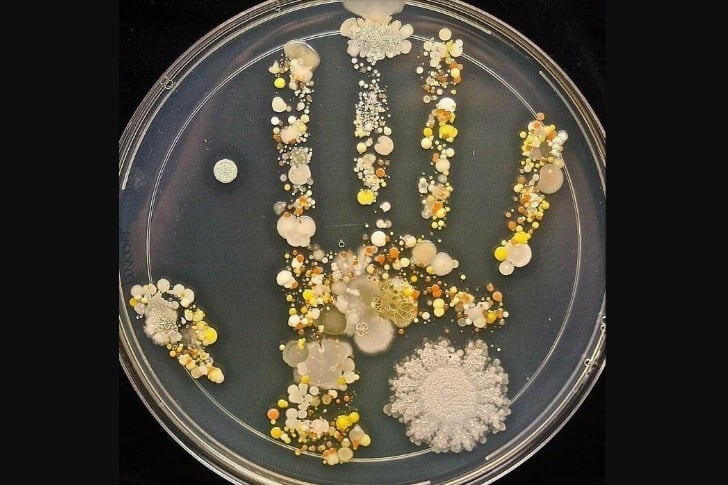 男の子が外遊びから帰ってきた後、お母さんが彼の手形を大きなシャーレに入れ、2日間培養したところ、こんなカラフルな細菌の庭が出来上がりました。