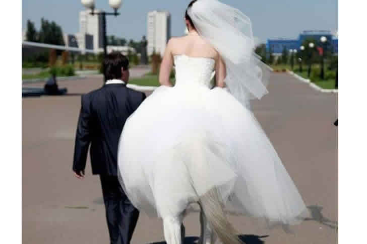 公園で撮影されたこの写真は、思わず二度見してしまう完璧なタイミングが印象的です。新郎新婦が歩く中、新婦のウェディングドレスと馬の後ろ姿がぴったり重なり、まるで新婦が馬の体を持っているかのようなユーモラスな錯覚が生まれました。背景の高層ビルと青空が都会的な雰囲気を醸し出す中、この一瞬がロマンチックなウェディングフォトに驚きと笑いを添えます。こんな偶然のタイミングが、特別な日をさらに楽しい思い出に変える魔法のような一枚です。
