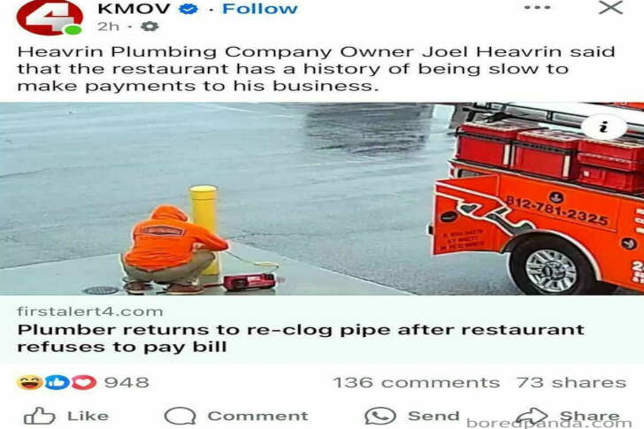 42 Photos Captured At The Exact Second Regret Kicked In #8 “Plumber Returns To Re-Clog Pipe After Restaurant Refuses To Pay Bill” Advertisements AnnesleyandCo Advertisements PREVNEXT PAGE Advertisements PREV NEXT PAGE