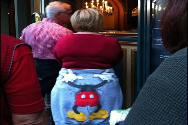 Wearing a Mickey Mouse–printed outfit is a classic way to show love for Disney, though this photo doesn’t appear to be taken at a theme park — it might even be from a more unexpected setting, like a church. While Mickey is best known as the face of Disney, the outfit itself adds a playful, whimsical touch to the scene.