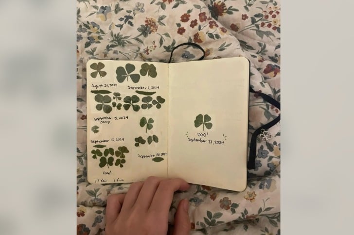 J’en suis à 605 maintenant ! J’en ai trouvé avec jusqu’à 7 feuilles. L’autre jour, j’ai trouvé 19 trèfles à quatre feuilles et 4 à cinq feuilles. J’ai commencé à les mettre dans ce livre et à les dater en 2021.