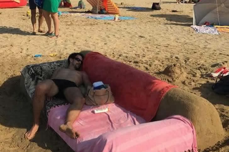 Alors que la plupart des baigneurs se contentent de construire des châteaux de sable ou de sculpter des dauphins, ce type a poussé les choses à un tout autre niveau : il a construit un véritable canapé en sable. Complet avec des serviettes drapées et des tissus décoratifs, c’est un chef-d’œuvre de plage qui lui permet de se détendre avec style sans se salir. Honnêtement, qui a besoin d’une chaise de plage quand on peut apporter son salon au bord de l’eau ?