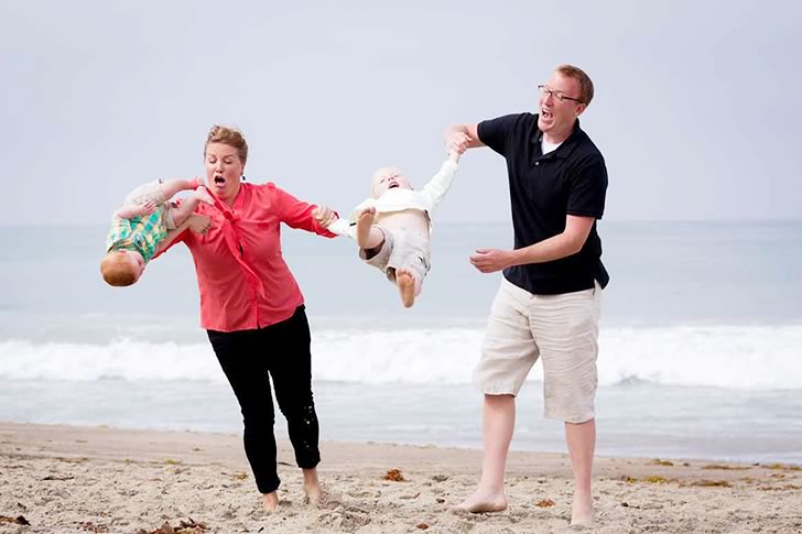 La mère semble effrayée, le père est sur le point d’éclater de rire, et l’enfant ressemble à un ballon de football emballé. Cette scène résume parfaitement les difficultés de prendre une belle photo de famille. Même si ce n’est pas toujours capturé sur l’image, c’est la réalité chaotique qui se déroule en coulisses lorsque vous essayez de faire poser un enfant.