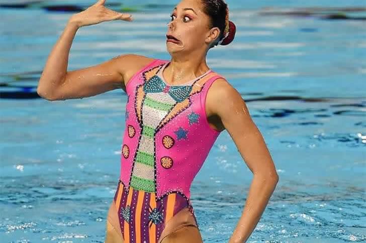 En este divertido momento, la natación sincronizada se convierte en teatro: una atleta con un colorido bañador simula que un tiburón le está mordiendo la cara.