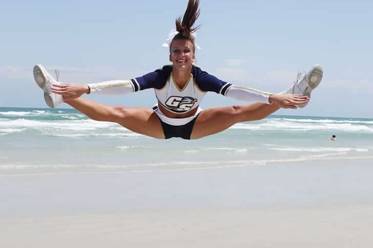 Aquí vemos a una animadora aparentemente flotando sin peso: piernas perfectas, postura perfecta. Estos saltos son el resultado de incontables horas de entrenamiento y mucho coraje.