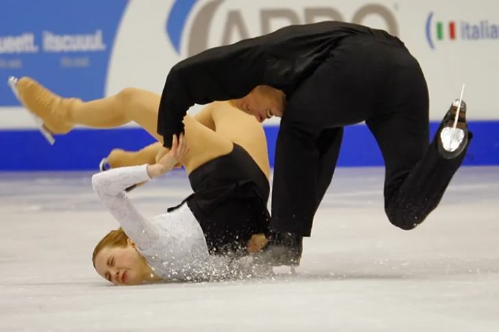 ¿Qué pasa cuando una bailarina que confía en sus habilidades rítmicas de repente se encuentra sobre hielo resbaladizo con cuchillas de metal bajo sus pies? Exacto: ¡una caída espectacular!