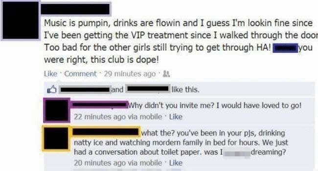 這些人在社交媒體上說謊,結果人贓俱獲 我是在做夢嗎? Advertisements 科技讓分享生活變得更容易,但也讓那些喜歡誇大其詞的人少了一層約束。人們與數百萬人分享他們的「狂野之夜」,卻忘了他們的真實朋友可能正在看著,隨時準備說出真相。 Advertisements 上頁下一頁 這個人試圖說服他們的追蹤者,他們徹夜狂歡直到日出。然而,他們整晚都在傳訊息的朋友在貼文下留言,提醒他們其實整晚都穿著睡衣待在家裡的沙發上。 Advertisements PREV NEXT PAGE