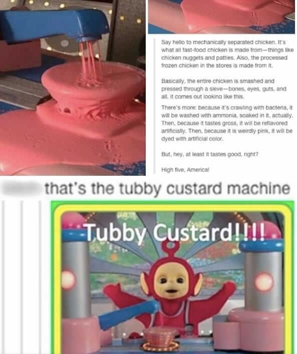 這些人在社交媒體上說謊,結果人贓俱獲 丁丁的卡士達機 Advertisements 當人們未經查證就分享「噁心」的事實時,錯誤資訊會像野火一樣蔓延。這名用戶分享了一張粉紅色黏稠物質的照片,聲稱那是速食餐廳用來製作加工雞塊的「粉紅泥」。 Advertisements 上頁下一頁 這則貼文迅速傳播並引起了許多人的反感,直到有人指出真相。這張圖片根本不是食物,而是兒童節目《天線寶寶》中「丁丁卡士達」機器的幕後照片。 Advertisements PREV NEXT PAGE