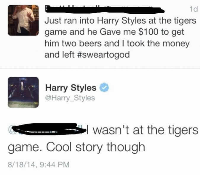 這些人在社交媒體上說謊,結果人贓俱獲 好心辦壞事 Advertisements 編造關於名人邂逅的故事已經成為一種奇怪的線上消遣,而這位用戶以為他也能加入成功酸民的行列。他分享了一個關於在棒球比賽中遇到哈利·史泰爾斯並收到一張百元大鈔的誇張故事,但他卻被當事人親自戳破謊言。 Advertisements 上頁下一頁 史泰爾斯親自留言回應這則貼文,表示他根本沒有去看那場比賽。雖然謊言被揭穿,但這位用戶確實達成了他的目的:與一位全球超級巨星進行了直接互動,即使那只是為了稱他為騙子。 Advertisements PREV NEXT PAGE