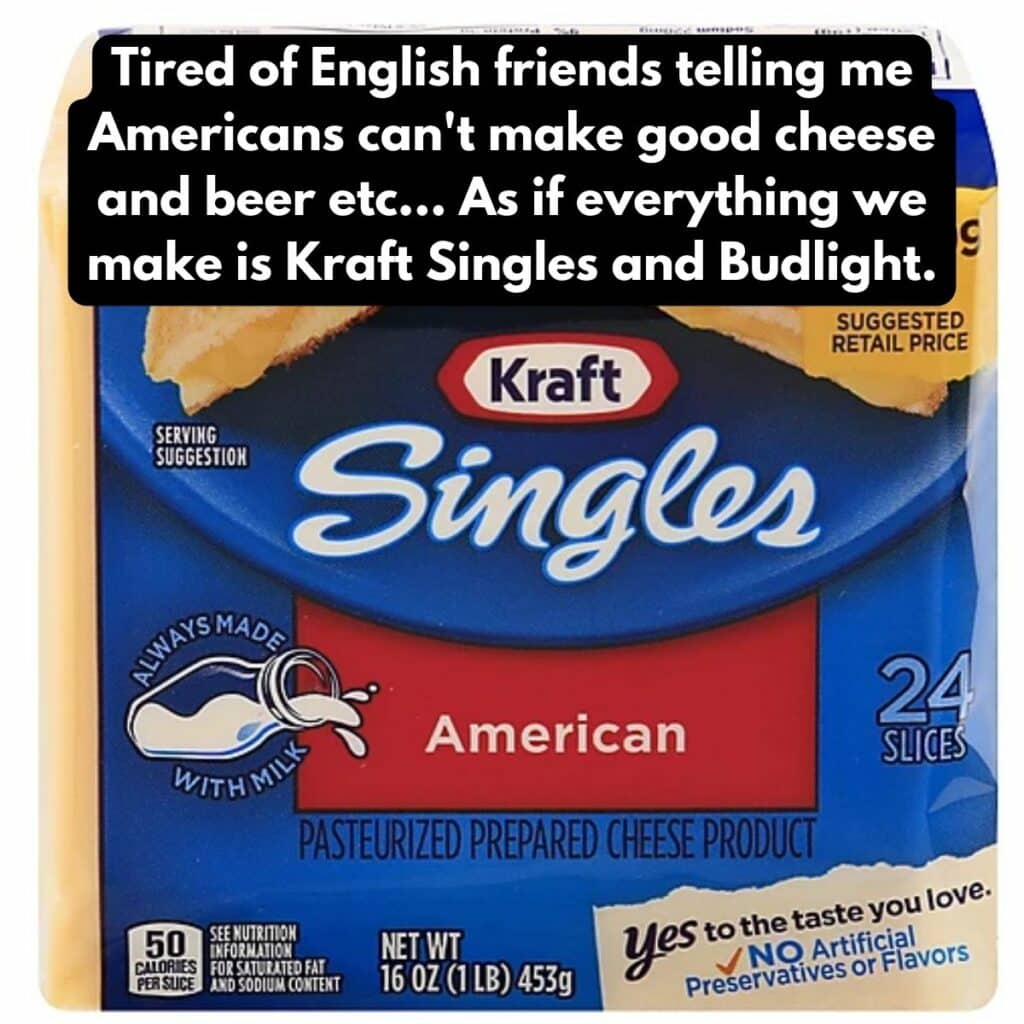 C’est comme si les Européens pensaient que tout ce que nous mangeons, ce sont des hamburgers et des hot-dogs en buvant de la bière dans un gobelet rouge Solo. Bien sûr,nous n’avons peut-être pas des siècles de traditions brassicoles et fromagères comme les Européens, mais cela ne signifie pas que nous ne pouvons pas tenir notre rang. Ont-ils même entendu parler de nos brasseries artisanales et de nos fromagers ?