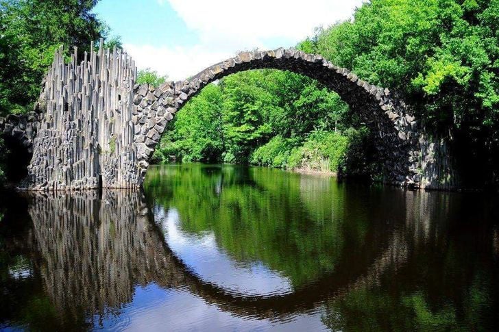 In einer Zeit, als es noch keine Autos und Tankstellen gab, entstand die “Rakotzbrücke”, auf Deutsch “Teufelsbrücke” genannt. Diese Brücke ist halbkreisförmig und bildet, wenn sie sich im Wasser spiegelt, einen perfekten Kreis. Dies erweckte den Eindruck, dass sie von einer anderen Welt erschaffen wurde, was ihr den Namen einbrachte. Heutzutage wird diese Geschichte als interessante Anekdote angesehen, die es wert ist, geteilt zu werden, und viele schöne Fotos werden in den sozialen Medien geteilt.