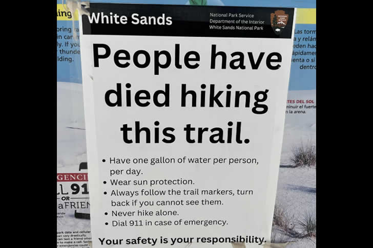 You Won’t Believe These Terrifying Warning Signs Spotted Around the World 9. White Sands National Park, NM only a 5 mile mostly flat trail, but the heat is intense! Advertisements Advertisements PREVNEXT PAGE Original post Advertisements PREV NEXT PAGE