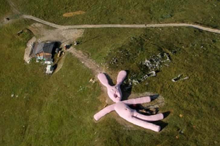 粉紅色的兔子很恐怖?更恐怖的是,牠很大隻,而且還腐爛到變成灰色。這隻巨大的兔子,在2005年被當成藝術裝置,設置在義大利北部科萊托法瓦山的山丘上。一開始,牠可是長達200英尺,高20英尺呢!因為兔子的「內臟」看起來好像爆出來一樣,所以給人一種從天空掉下來的感覺。